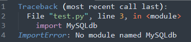 如果执行后的输出结果如下所示,意味着你没有安装 MySQLdb模块: