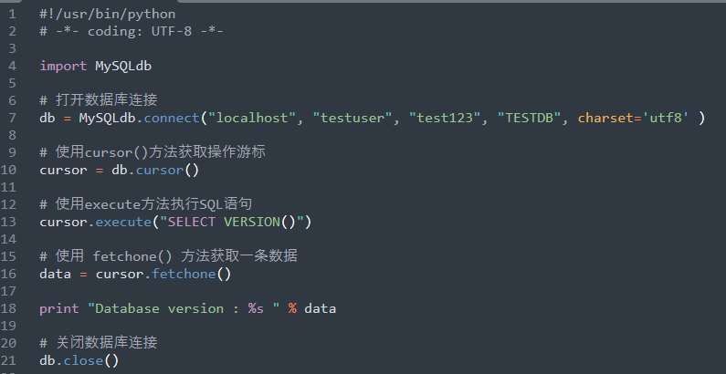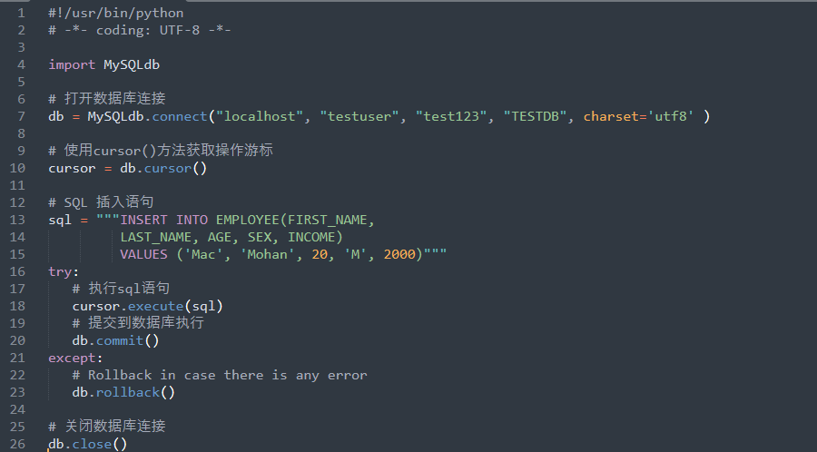 连接数据库TESTDB使用的用户名为“testuser”,密码为 “test123”,你可以自己设定或者直接使用root用户名及其密码,Mysql数据库用户授权请使用Grant命令。
