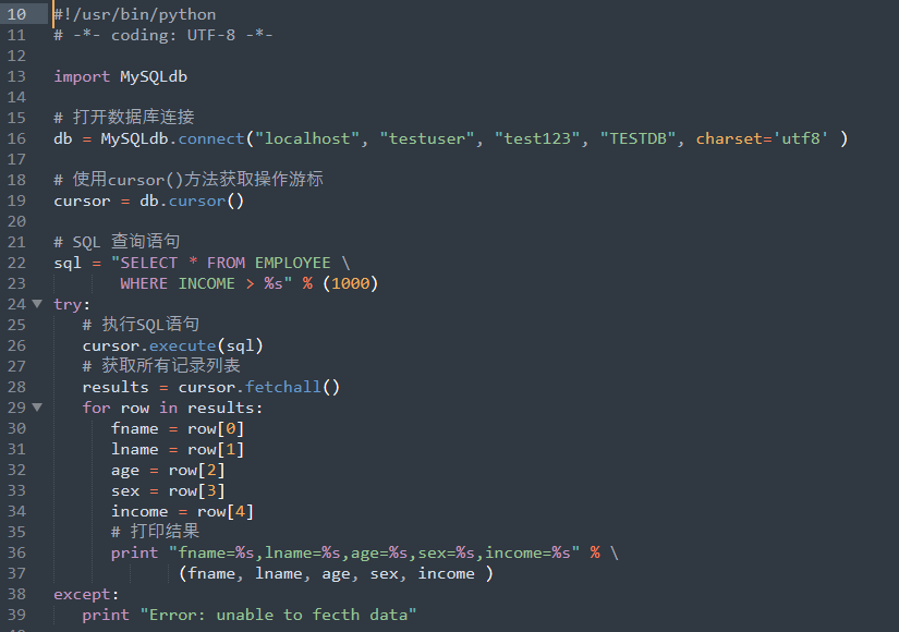 Python查询Mysql使用fetchone()方法获取单条数据, 使用fetchall()方法获取多条数据。