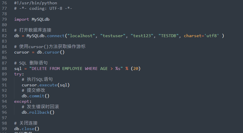删除操作是用于删除数据表中的数据,以下实例演示了删除数据表 EMPLOYEE 中 AGE 大于 20 的所有数据: