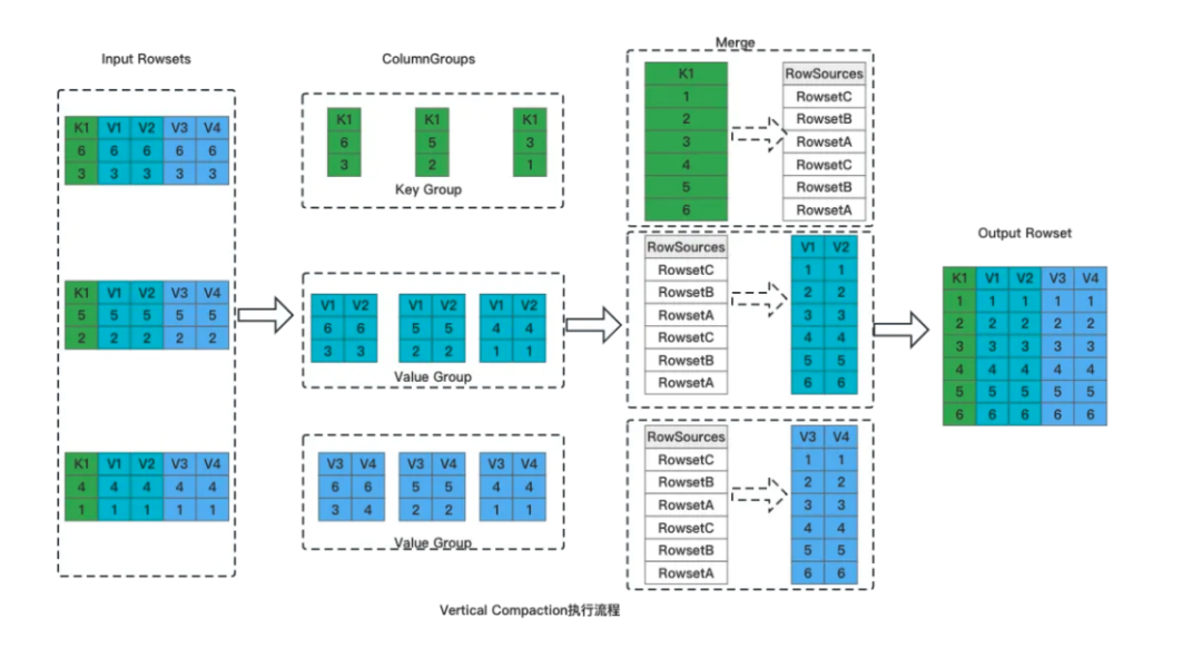 Key 列合并。Key 列的顺序就是最终数据的顺序,多个 Rowset 的 Key 列采用堆排序进行合并,产生最终有序的 Key 列数据。在产生 Key 列数据的同时,会同时产生用于标记全局序 RowSources。