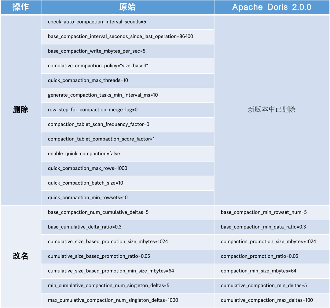 在 Compaction 的易用性方面,Doris 2.0.0 版本进行了系统性优化。结合长期以来 Compaction 调优的一些经验数据,默认配置了一套通用环境下表现最优的参数,同时大幅精简了 Compaction 相关参数及语义,方便用户在特殊场景下的 Compaction 调优。