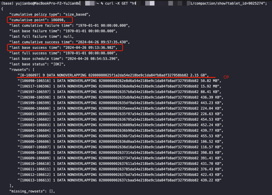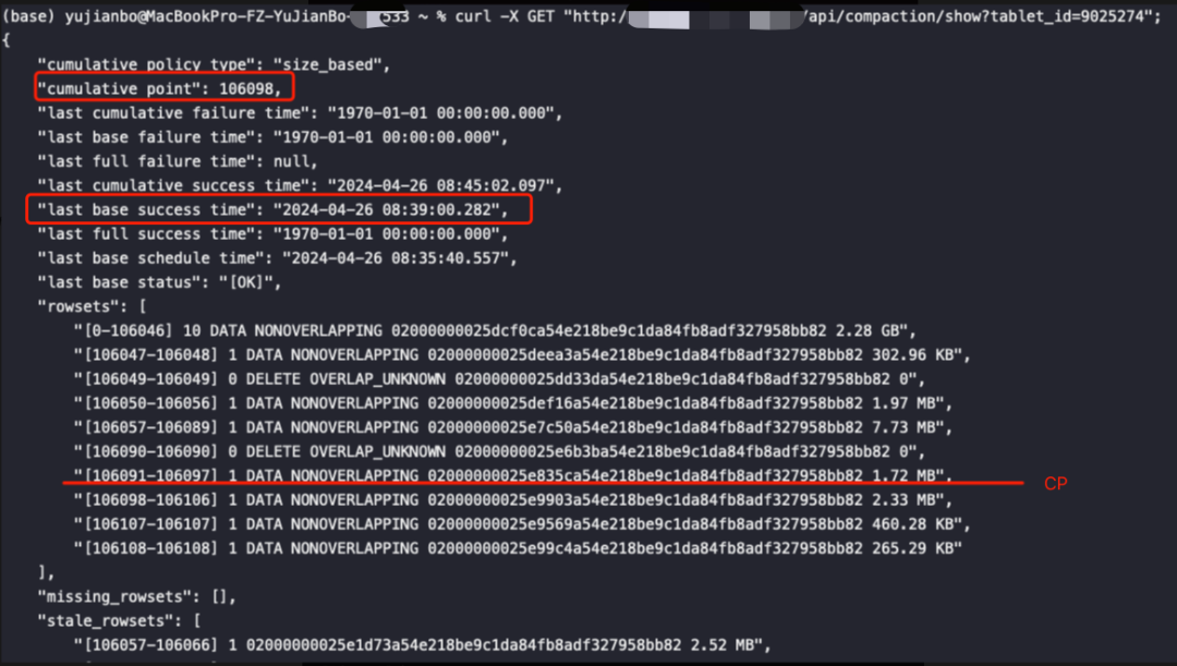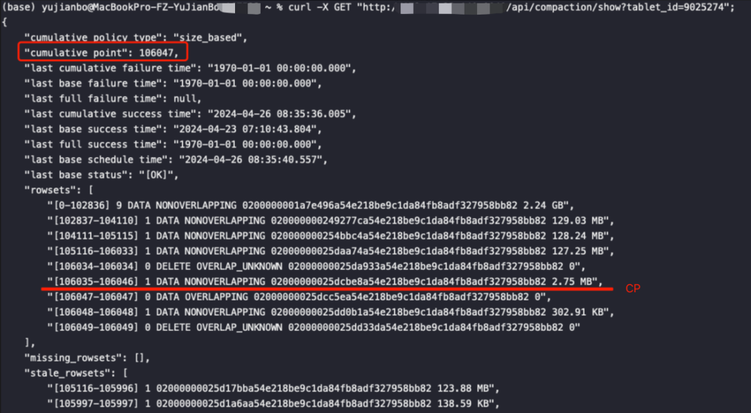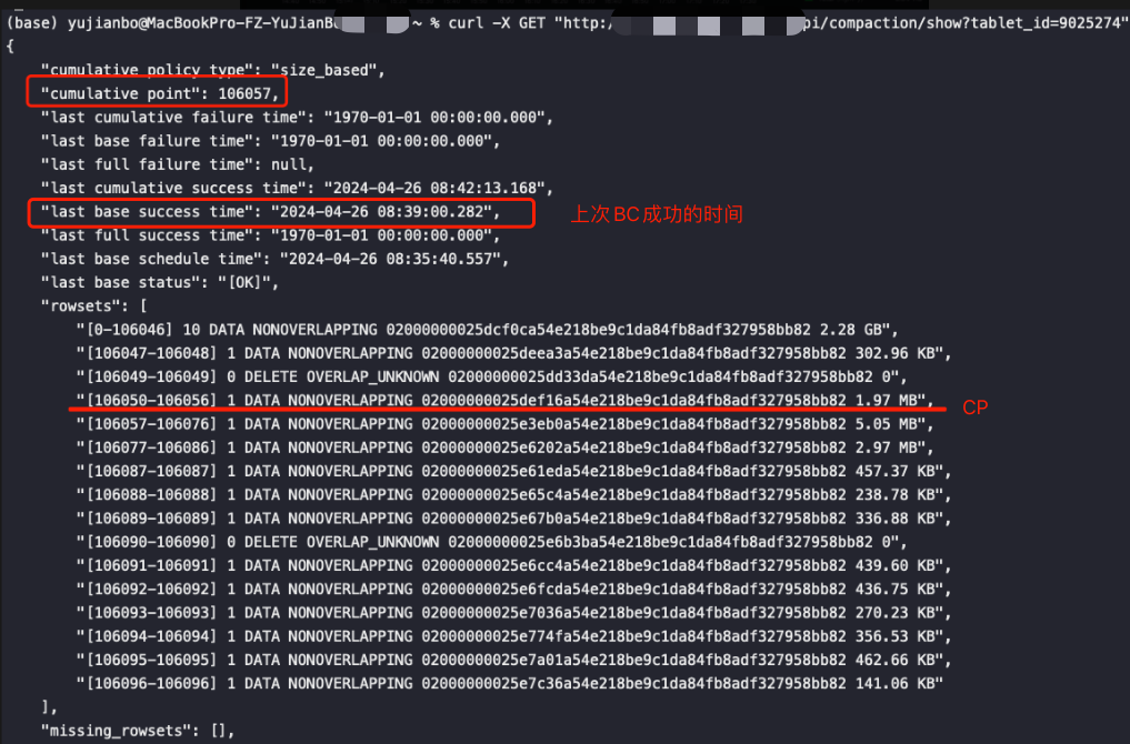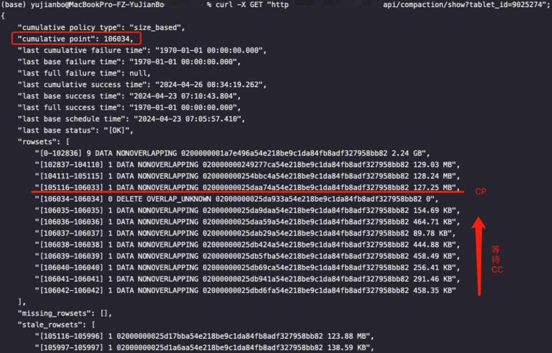 1. 以9025274这个Tablet为例,讲解Compaction过程,下图可以看到数据正常写入,CP为106034,CP上面的rowset都是经过CC后变成大块头晋升到BC区域等待BC。CP下面就是等待CC的rowset: