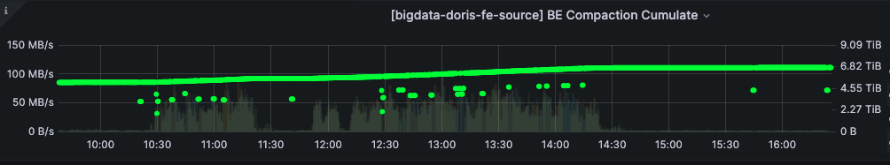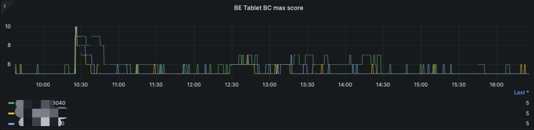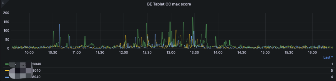 可以看到下图12点到14点期间在测试大数据量数据写入测试,各个BE节点的BE Compaction Score统计值很高,简单来说就是特定的tablet中有很多的rowsets正在等待Compaction: