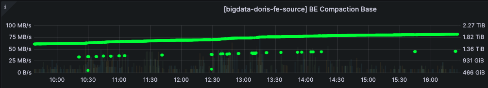 doris_be_tablet_base_max_compaction_score、doris_be_tablet_cumulative_max_compaction_score 代表的是集群中所有 Backend (BE) 节点上观察到的某个特定 tablet 的最大CC、BC compaction 分数。这个指标用于监控现有 tablet 中的最高 的CC、BC compaction 需求,通常反映出数据存储层面可能存在的问题或对优化操作的需求。如果这个分数过高,可能意味着相应的 tablet 需要优先进行 compaction,以改善查询性能和数据存储的效率。
