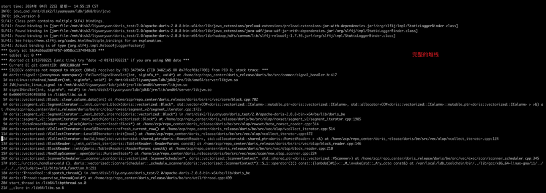 1. 首先BE core了之后先不要着急,可以先尝试将服务拉起来(建议配置自动拉起),后续继续排查。首先观察堆栈信息,堆栈中有一个 Query id ,这个一般是导致BE core的query
