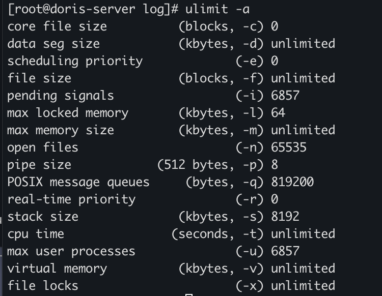 2. 第一行 core file size 为0,则不会生成CoreDump。使用 ulimit -c [kbytes] 命令可以设置系统允许生成的CoreDump的文件大小。所以在BE启动时,加入以下命令 即可ulimit -c unlimited -n 65536 && sh start_be.sh --daemon启动后可以通过 cat proc/{be pid}/limits 确认是否成功开启coredump,core file size是 unlimited 则表示已经成功打开