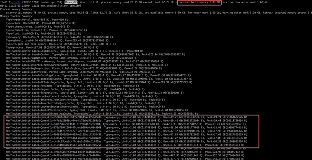 b. 11:26:00 - 11:26:02 GC发现系统内存不足陆续cancel了这10个query,此时系统可用内存只剩3G