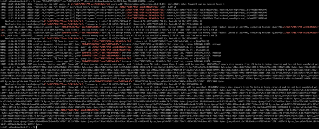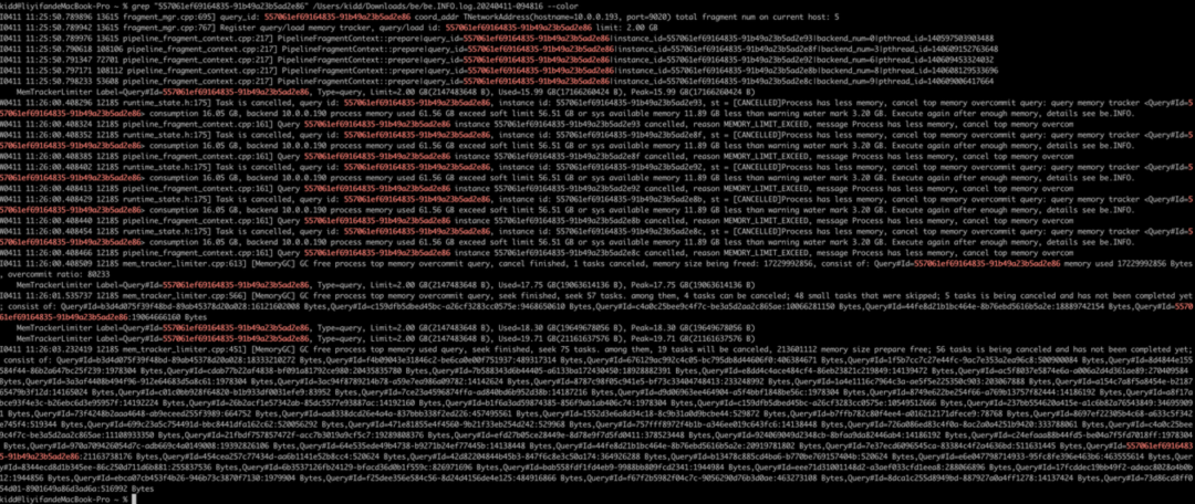 MemTrackerLimiter Label=Query#Id=557061ef69164835-91b49a23b5ad2e86, Type=query, Limit=2.00 GB(2147483648 B), Used=19.71 GB(21161637576 B), Peak=19.71 GB(21161637576 B)