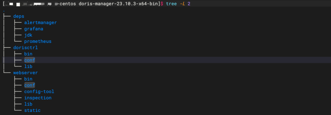 deps // Doris Manager 管控依赖组件alertmanager // 告警工具grafana // 监控看板工具jdk // jdk依赖包prometheus // 监控指标存储工具dorisctrl // Doris Manager 管控组件bin // 启停脚本conf // 配置文件lib // 服务二进制webserver // Doris Manager Web 服务组件,这是网页入口服务,需要手工启动bin // 启停脚本conf // 配置文件config-tool // Doris Manager 服务管理工具inspection // 巡检脚本lib // 服务二进制static // 前端静态文件