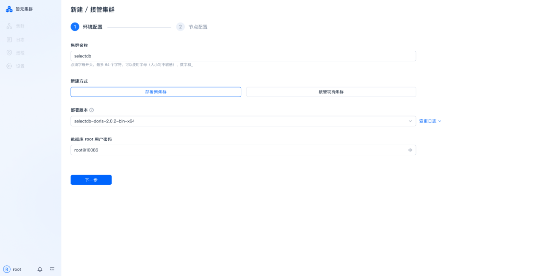 填写自定义的集群名称、选择部署版本(会根据填写的包路径自动识别)以及数据库root用户密码后,点击【下一步】。