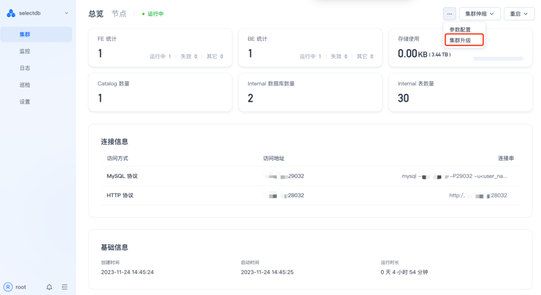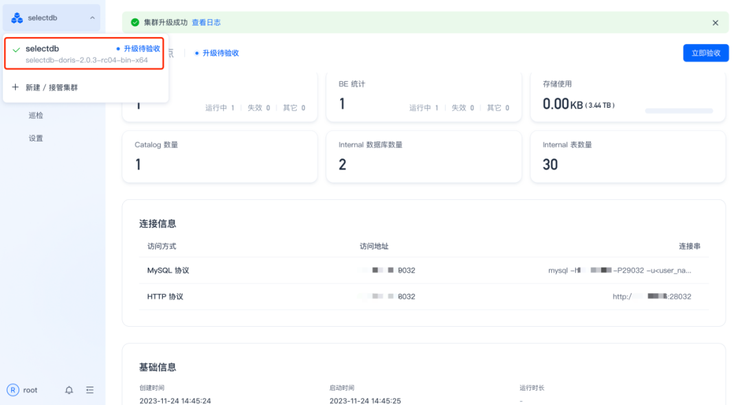 选择目标版本,这里用的是SelectDB 2.0.3 rc04作为升级的目标版本,之后直接点点即可。