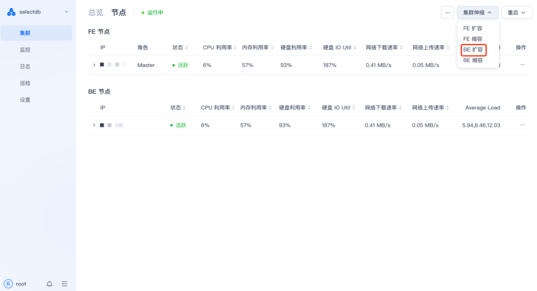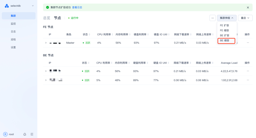 以刚刚扩容的BE为例,选择【BE缩容】。