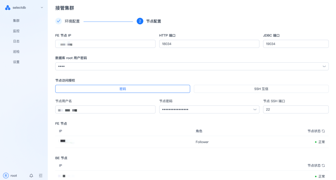 填写FE的IP/HTTP端口/JDBC端口以及节点用户名/密码/SSH端口后,Manager会自动识别待接管集群的FE和BE节点信息。