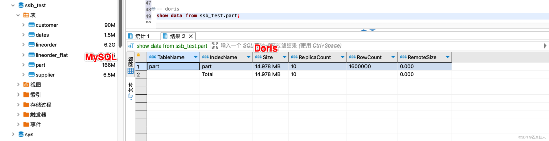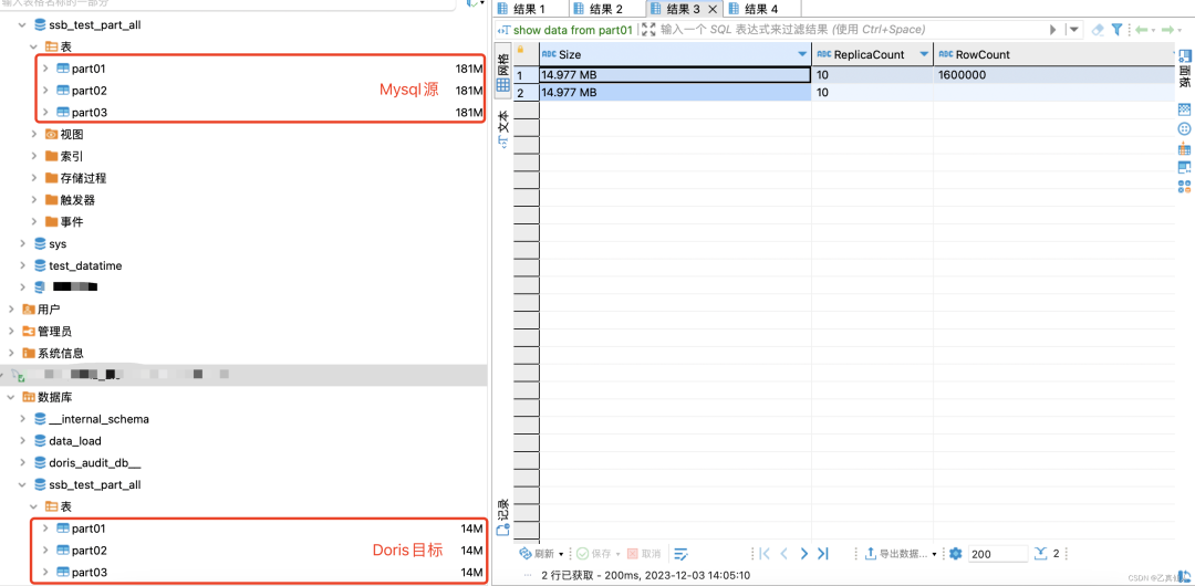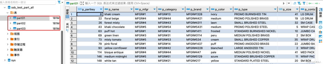 -- 创建测试库create database ssb_test_part_all;-- 创建测试表 part01~3CREATE TABLE `part03` (`p_partkey` int(11) DEFAULT NULL,`p_name` varchar(23) DEFAULT NULL,`p_mfgr` varchar(7) DEFAULT NULL,`p_category` varchar(8) DEFAULT NULL,`p_brand` varchar(10) DEFAULT NULL,`p_color` varchar(12) DEFAULT NULL,`p_type` varchar(26) DEFAULT NULL,`p_size` int(11) DEFAULT NULL,`p_container` varchar(11) DEFAULT NULL) ENGINE=InnoDB DEFAULT CHARSET=utf8-- 数据写入 part01~3insert into ssb_test_part_all.part01select * from ssb_test.part