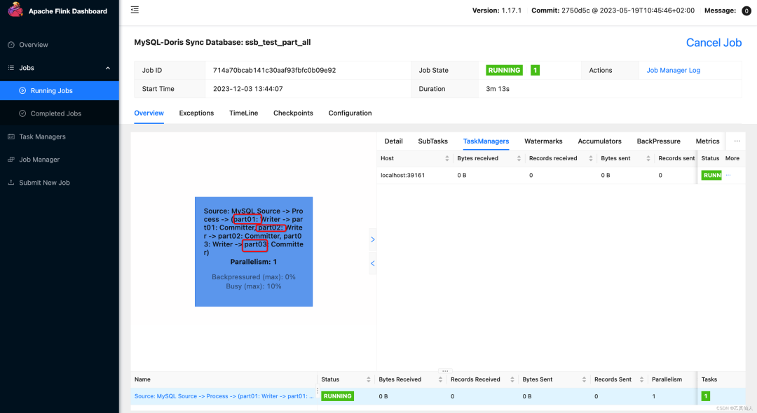 ./bin/flink run \-Dexecution.checkpointing.interval=10s \-Dparallelism.default=1 \-c org.apache.doris.flink.tools.cdc.CdcTools \lib/flink-doris-connector-1.17-1.5.0-SNAPSHOT.jar \mysql-sync-database \--database ssb_test_part_all \--mysql-conf hostname=127.0.0.0.12 \--mysql-conf port=3306 \--mysql-conf username=root \--mysql-conf password=root \--mysql-conf database-name=ssb_test_part_all \--mysql-conf scan.startup.mode=initial \--mysql-conf scan.incremental.snapshot.chunk.key-column=ssb_test_part_all.part01:p_partkey,ssb_test_part_all.part02:p_partkey,ssb_test_part_all.part03:p_partkey \--including-tables ".*" \--sink-conf fenodes=127.0.0.0:8030 \--sink-conf username=root \--sink-conf password=root \--sink-conf jdbc-url=jdbc:mysql://127.0.0.0:9030 \--sink-conf sink.label-prefix=label \--table-conf replication_num=1 \