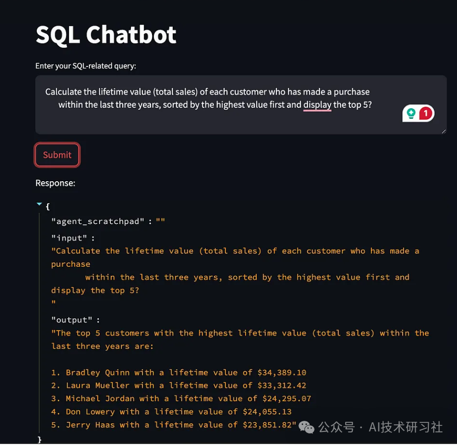 import osimport streamlit as stfrom langchain_openai import ChatOpenAIfrom langchain_community.utilities import SQLDatabasefrom langchain_community.agent_toolkits import create_sql_agent# Set your OpenAI API key hereos.environ["OPENAI_API_KEY"] = "Your OpenAI API Key"# Directly using database connection detailshost = "localhost"user = "root"password = "Your MySQL Password"database = "SalesOrderSchema"# Setup database connectiondb_uri = f"mysql+mysqlconnector://{user}:{password}@{host}/{database}"db = SQLDatabase.from_uri(db_uri)llm = ChatOpenAI(model="gpt-4", temperature=0)agent_executor = create_sql_agent(llm, db=db, agent_type="openai-tools", verbose=True)# Streamlit app layoutst.title('SQL Chatbot')# User inputuser_query = st.text_area("Enter your SQL-related query:", "List Top 10 Employees by Salary?")if st.button('Submit'):#try:# Processing user input#response = agent_executor.invoke(user_query)#response = agent_executor.invoke({"query": user_query})#if st.button('Submit'):try:# Processing user inputresponse = agent_executor.invoke({"agent_scratchpad": "", # Assuming this needs to be an empty string if not used"input": user_query # Changed from "query" to "input"})st.write("Response:")st.json(response) # Use st.json to pretty print the response if it's a JSONexcept Exception as e:st.error(f"An error occurred: {e}")