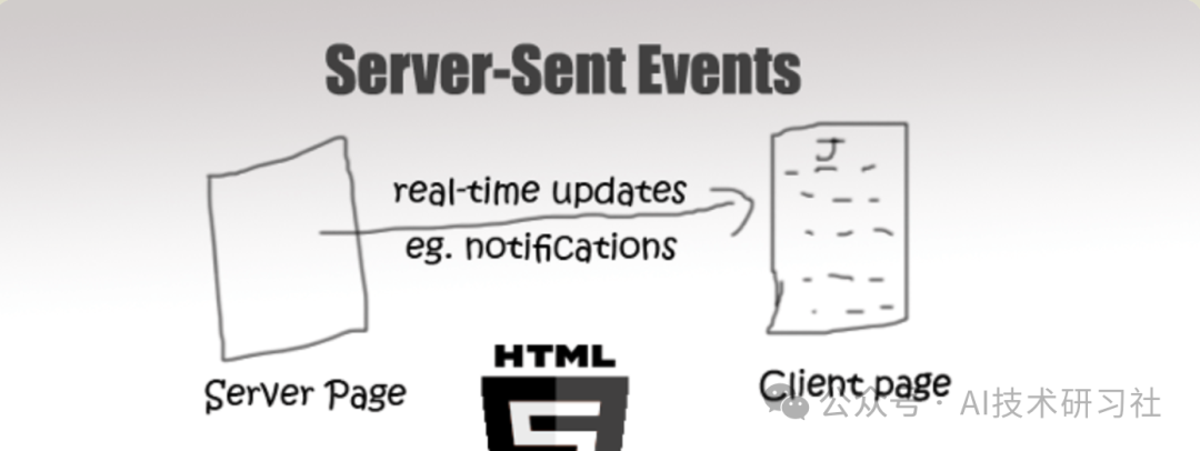 服务器发送事件(SSE)是一种单向的流式传输技术,允许服务器向客户端连续发送更新。与 WebSocket 不同,SSE 只需打开一个 HTTP 连接即可实现持续推送,非常适合用于不要求双向实时通信的场景,例如大语言模型的流式对话。