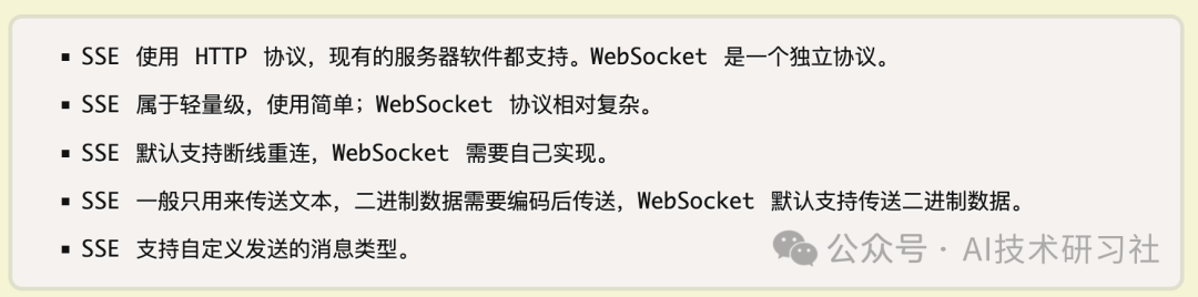轻量级实现:SSE 基于 HTTP 协议,避免了 WebSocket 的双向通信复杂性,适合轻量级应用。