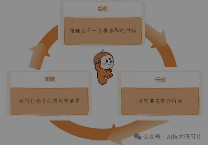 ReAct框架的核心在于将推理和行动紧密结合起来。它不是一个简单的决策树或固定算法,而是一个综合系统,能够实时地进行信息处理、决策制定,以及行动执行。ReAct框架的设计哲学是:在动态和不确定的环境中,有效的决策需要持续的学习和适应,以及快速将推理转化为行动的能力,即形成有效的观察—思考—行动—再观察的循环。