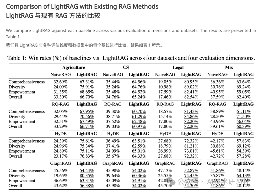为了解决这些问题,我们推出了LightRAG。这一创新框架将图形结构引入文本索引和信息检索过程,采用双级检索系统,提升了从低级和高级知识发现中获取综合信息的能力。图形结构与向量表示的结合,不仅优化了检索效率,还支持对相关实体及其关系的精确搜索,显著缩短响应时间,并保持强烈的上下文关联性。增量更新算法的集成,确保了系统在动态数据环境中的敏捷性和时效性。