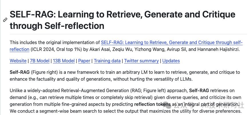 论文开源项目self-rag(https://github.com/AkariAsai/self-rag)实现了自反射RAG。可以从HuggingFace Hub下载Self-RAG。对于推理,该项目建议使用VLLM来提高推理的效率。其他更多内容,读者可访问该项目自行阅读。