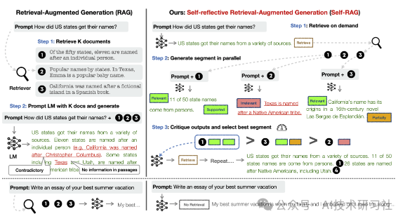 Self-RAG还会对生成的内容进行自我评估,确保输出的质量和事实准确性。这种自我反思的机制使得模型能够在生成过程中不断优化其输出。