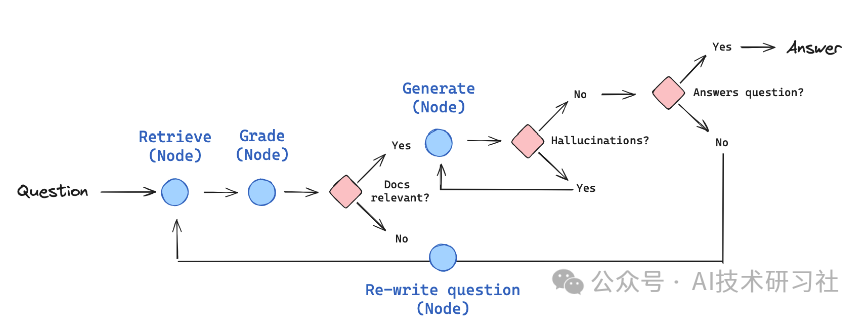 这种工作流的设计使得各节点可以独立处理不同的任务,并根据上下文动态调整执行顺序,提高了模型生成回答的质量和适应性。每个节点代表一个特定的处理步骤(如检索、生成、评估等),而边则定义了各步骤之间的依赖关系和数据流向。