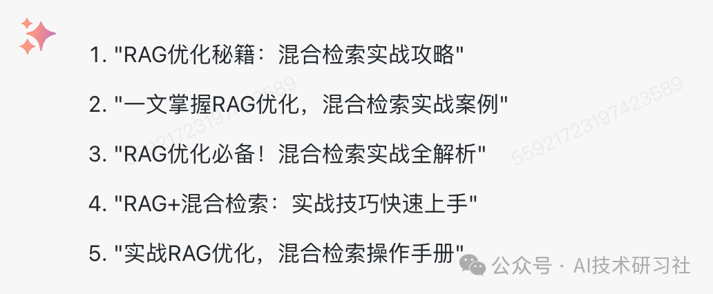 假如你是一个自媒体资深撰稿人,根据我提供的信息,生成5个爆款标题,字数限制在20字以内:RAG优化方法、混合检索、应用实战