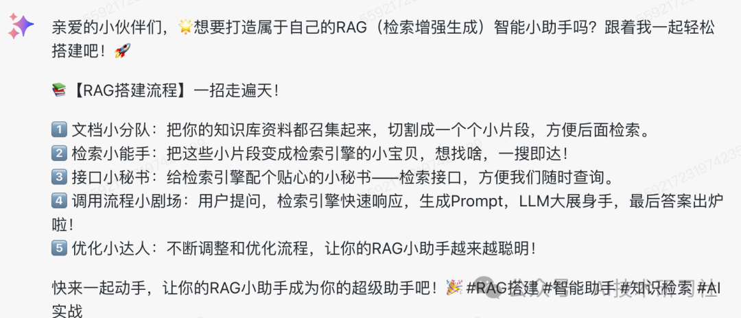假如你是一个小红书资深撰稿人,根据我提供的信息,给我生成一个小红书风格的文字描述:RAG的搭建流程
