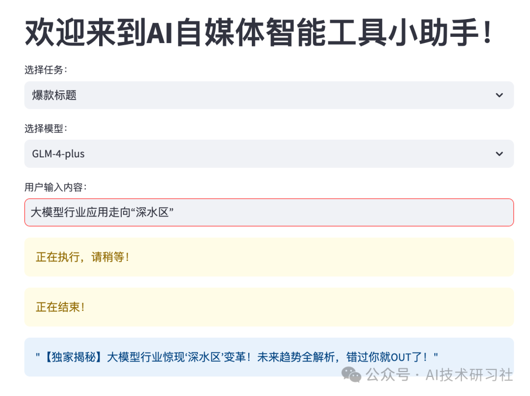 很好!这样我们就完成了大模型工具集的MVP版本开发。接下来,如果需要更丰富的可视化界面和更强大的输入功能,可以在现有基础上继续迭代开发。这将进一步提升用户体验,使工具的操作更加直观,功能更加全面,帮助创作者更高效地进行内容创作和发布。