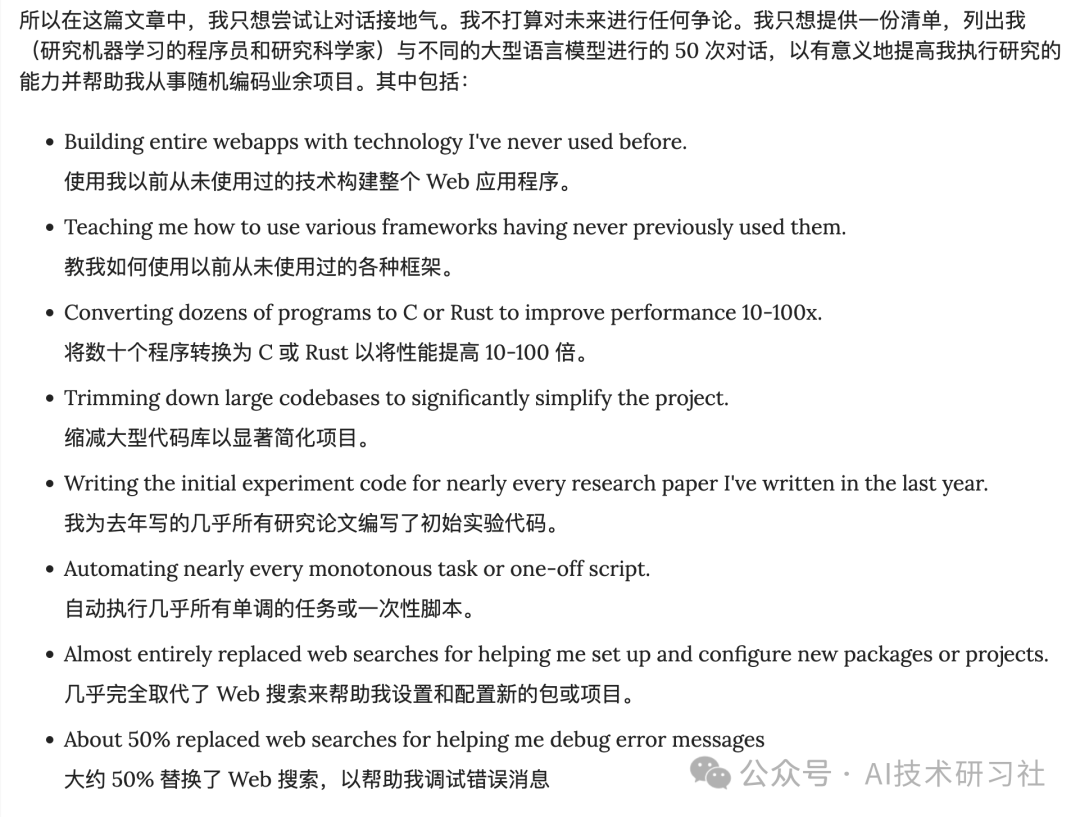 AI应用实例:Carlini列举了50个他使用AI的实际例子,这些例子覆盖了工作效率提升、创意写作、编程辅助等多个方面。