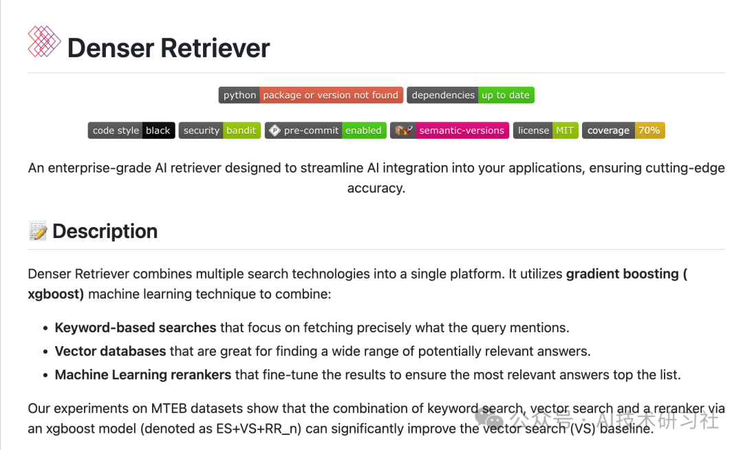 Denser Retriever 完全开源,允许用户轻松构建自己的 RAG 应用和聊天机器人。DenserAI 团队推出的 Denser Retriever 在快速原型设计方面表现卓越。它将关键词搜索、向量搜索和机器学习重排序结合在一个平台中,并通过梯度提升(xgboost)技术优化搜索结果。
