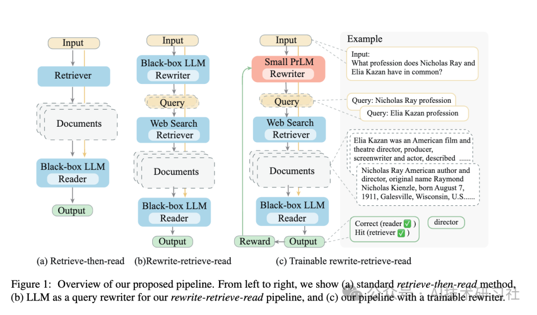 上图,从左到右,我们展示了(a)标准的retrieve-then-read方法,(b)LLM 作为我们的 rewrite-retrieve-read管道的查询重写器,以及(c)带有可训练重写器的管道。