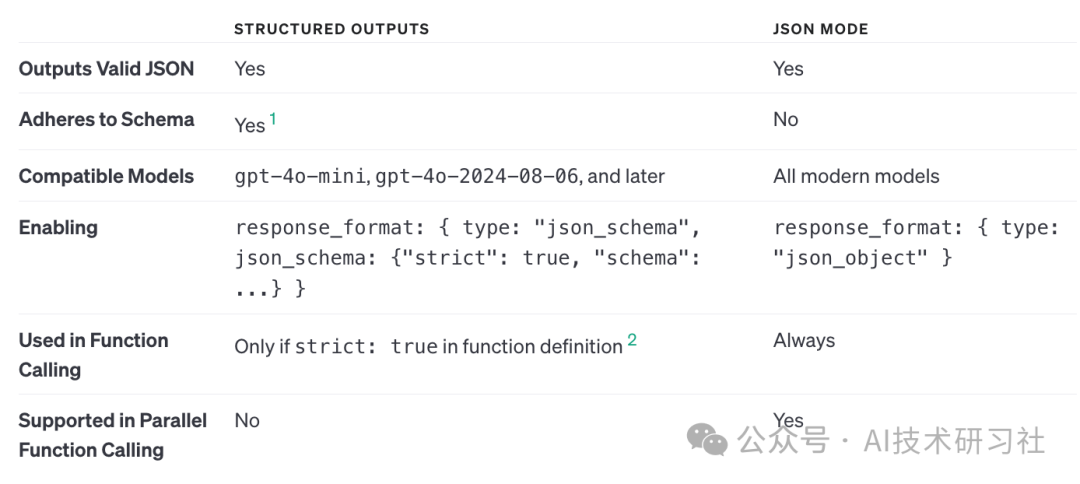 结构化输出是JSON模式的演变。虽然两者都确保生成有效的 JSON,但只有结构化输出确保架构合规性。Chat Completions API、Assistants API、Fine-tuning API 和 Batch API 都支持结构化输出和 JSON 模式。