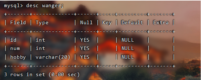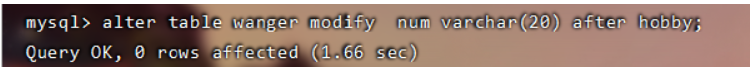 (alter table wanger modify num varchar(20) after hobby;) 修改字段的排名位置;