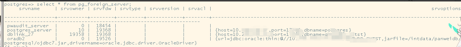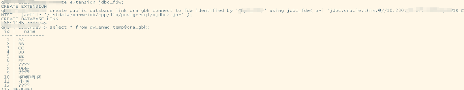 create public database link ora_gbk connect to fdw identified by 'xx' using jdbc_fdw( url 'jdbc:oracle:thin:@//10.230.xx.xx:1688/xx', jarfile '/intdata/panweidb/app/lib/postgresql/ojdbc7.jar' );