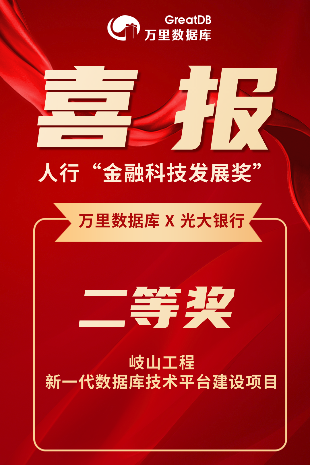 近日,中国人民银行官方发布“2023年度金融科技发展奖获奖项目”名单。万里数据库深度参与的中国光大银行(以下简称:光大银行)岐山工程--新一代数据库技术平台建设项目荣获二等奖,彰显了光大银行在金融科技领域的技术先进性和创新能力,也对万里数据库在金融数字化领域的专业技术实力做出肯定。