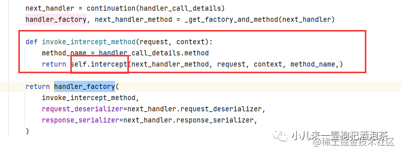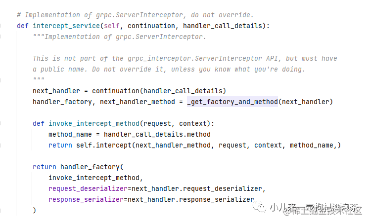 官网关于拦截器grpc.ServerInterceptor使用到的RpcMethodHandler自介绍,深入到第三方库的时候其实里面处理返回也是一个RpcMethodHandler