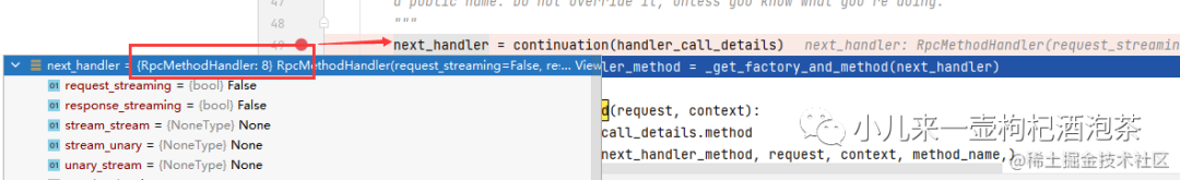 返回一个RpcMethodHandler对象实例。next_handler = continuation(handler_call_details)