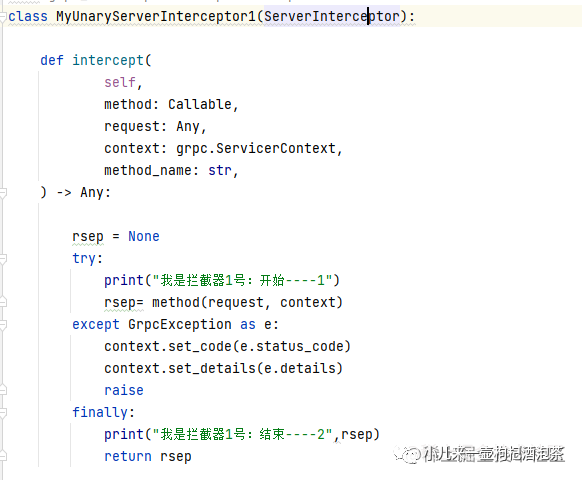 1:定义一个自己的需要实现的抽象类,这个抽象类实现了官网的grpc.ServerInterceptor抽象方法 2:在实现grpc.ServerInterceptor抽象方法intercept_service里面通过