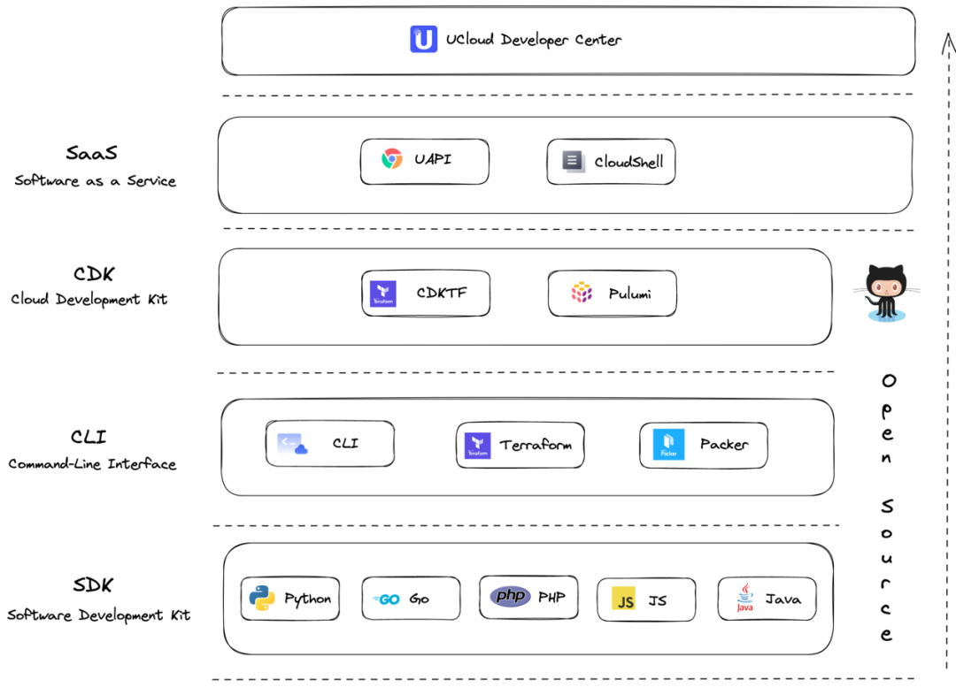 除了上述的技术因素之外,文化因素也很大程度上决定了开发者工具的形态。随着云原生时代的到来,开源软件如雨后春笋般涌现。开发者工具的增长同样遵循开源软件的「礼物文化」。这个概念来自于《大教堂与集市》,是指开源社区的贡献和赠予是一种非零和的博弈,开发者工具的开源并不会给云厂商造成经济上的损失,反而可以获得声誉、品牌影响力上的回馈。在 UCloud 的开发者工具的路线中,开源文化贯穿始终。对于日新月异的技术发展,UCloud 采取了积极向开源社区上游集成的路线,比如 Terraform、Packer、Pulumi 等。这样既可以避免社区的割裂,让用户可以使用自己最喜欢的工具;同时也可以通过技术贡献,反哺社区的发展,加速新技术的引进,为国内基础软件行业贡献出自己的一份力量。开发者工具代表了用户的使用习惯,形态各异,纷繁复杂。长期以来,由于新的工具不断涌现,对于云服务提供商的工程能力,形成了极大的挑战。