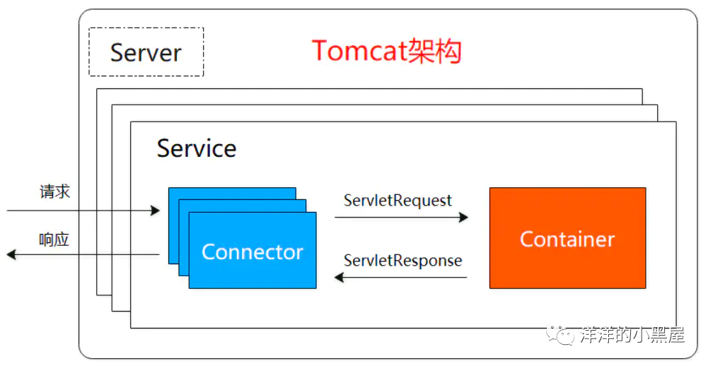 称作连接器,是 Service 的核心组件之一,一个 Service 可以有多个 Connector,主要连接客户端请求,用于接受请求并将请求封装成 Request 和 Response,然后交给 Container 进 行处理,Container 处理完之后在交给 Connector 返回给客户端。