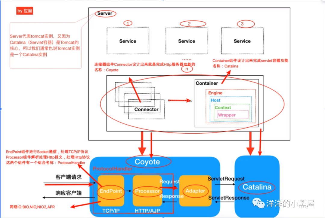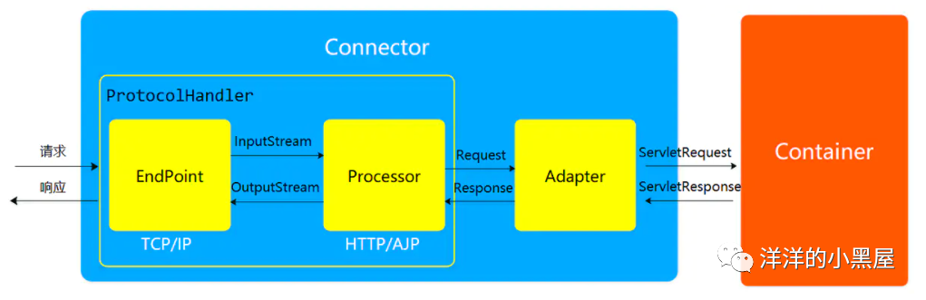 以上分别对应三个组件 EndPoint、Processor、Adapter 来完成。Endpoint 负责提供请求字节流给Processor,Processor 负责提供 Tomcat 定义的 Request 对象给 Adapter,Adapter 负责提供标准的 ServletRequest 对象给 Servlet 容器。