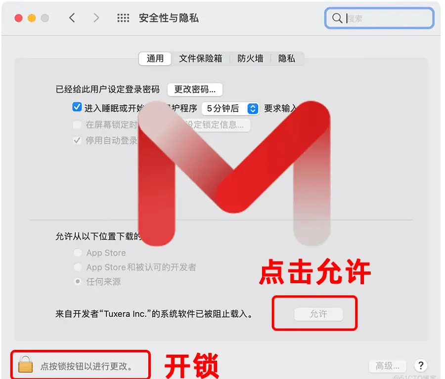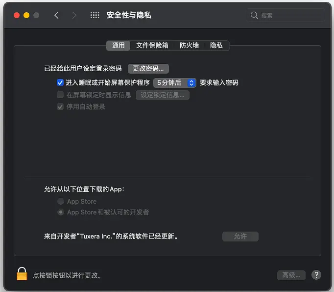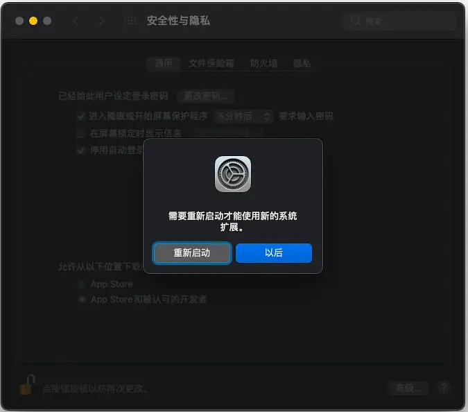 设置成功之后,点击屏幕左上角的苹果标志重启电脑,重启之后运行软件,屏幕上会跳出“系统扩展已被阻止”窗口,点击【打开安全性偏好设置】,在出现的安全性与隐私窗口中,首先点击左下角的小锁进行解锁,然后再点击【允许】,按照提示进行重新启动即可。
