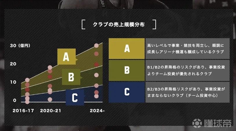 B联赛目标是创造俱乐部、利益相关者和社区相互支持的良性循环,振兴社区。但在现行以竞技成绩升降级的体制下,虽然部分俱乐部能够在高水平上平衡经营,并稳步发展,但依然存在升降级风险。