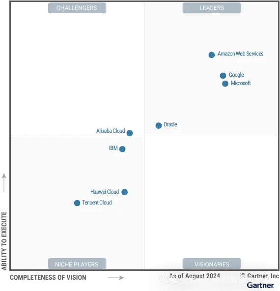 Gartner 于 2024 年 10 月 21 日发布的战略云平台服务魔力象限展示了国际云服务厂商与中国厂商在全球舞台上的局势。令人遗憾的是,中国的三大云服务提供商:华为云、阿里云和腾讯云,在本次魔力象限中的表现不尽如人意。