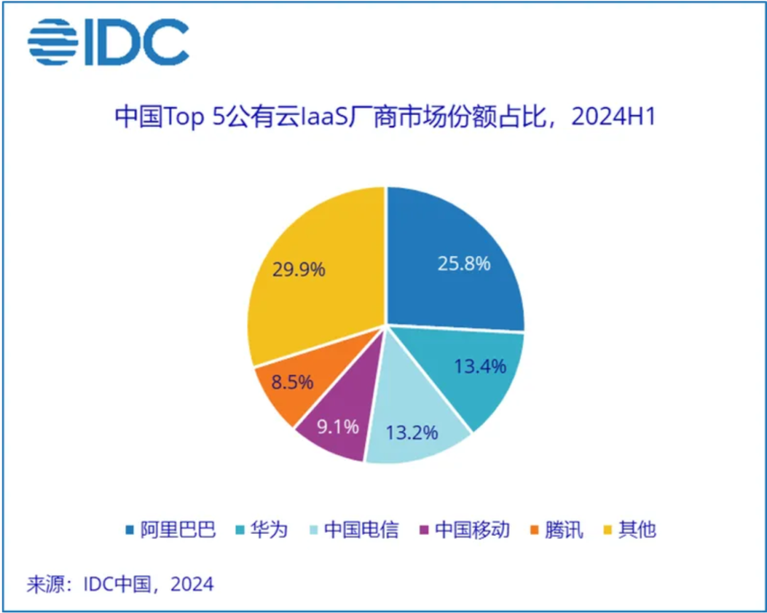 2024年上半年IaaS市场,阿里巴巴、华为、中国电信、中国移动和腾讯为市场排名前五,市场份额总和为70.1%,集中度同比下降2.3%。国际背景云厂商和算力服务云服务商在AI快速发展的前提下,其市场份额提升较快,是市场前五集中度下降的主要原因。