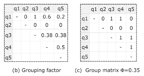 所有在中的频率之和记为。给定两个图和,我们用表示。例如:上图中的和。. 我们用表示与中的对应的的最大实例子图中的实例数。最后我们可以定义group factor: . group factor 可以理解为是对 归一化的值。它越大,两个图的最大公共子图往往也越大。计算两两查询图之间的 group factor,可以得到一个矩阵。如下图(b).
