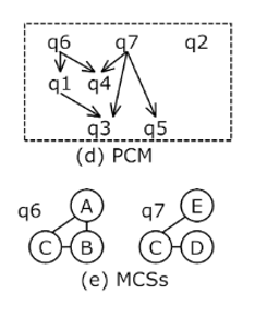 我们可以设置一个阈值,作为判断两个图是否相似的基线:如果 表示 相似。通过设置阈值,我们把 group factor 矩阵转化为了一个 01 矩阵,如上图(c). 根据这个 01 矩阵,算法会构建一个查询图的包含关系图,叫做PCM,如下图(d)。PCM的构建方法是:算法把01矩阵看作一个图的邻接矩阵,在这个图中找到所有的团。团内随机两两配对,计算它们的最大公共子图,然后连接包含关系。这组产生最大公共子图又作为下一层次的组。重复以上步骤。直到组里面的图只剩一个图。